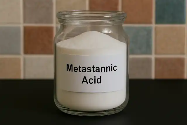 Metastannic acid finds use in various industrial applications including catalysis, as a precursor for tin dioxide materials, in ceramic formulations, and in certain chemical synthesis processes. Its amphoteric nature makes it valuable in specialized chemical applications.